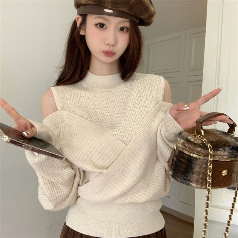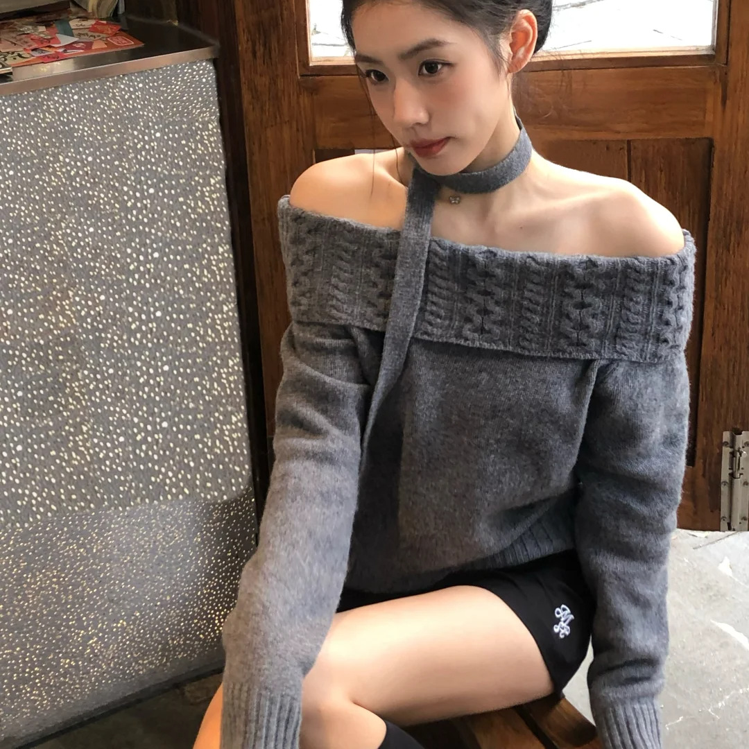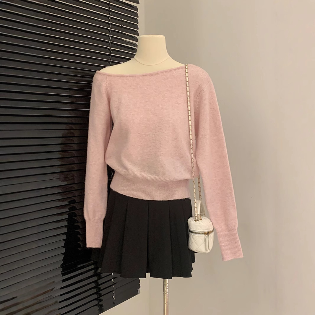 韓国系の斜め肩の長袖のニットの短い上着の女性の秋冬の底の新型の独特な1字の肩のセーター