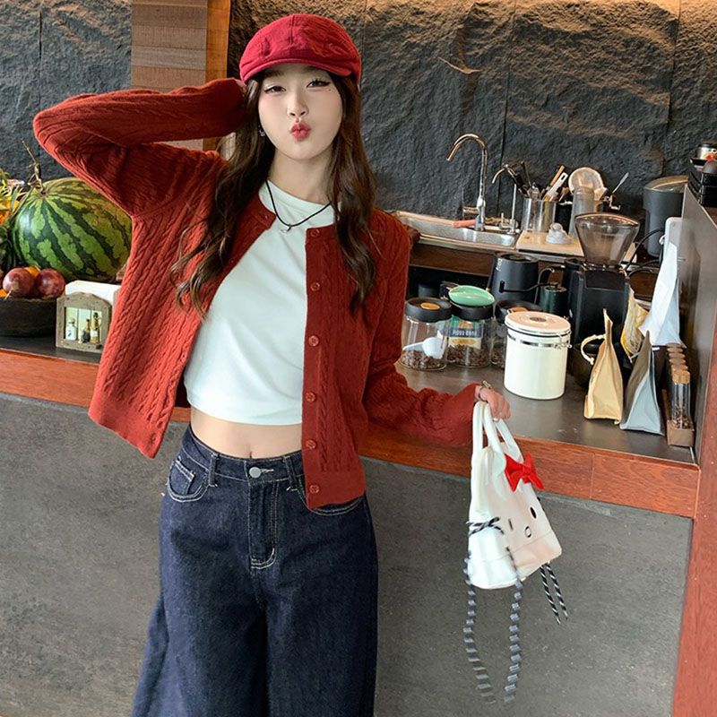 赤い短いセーターのコートの女性は秋冬にニットの底のカーディガンの小さい背のレースの蝶結びの上着を掛けます。