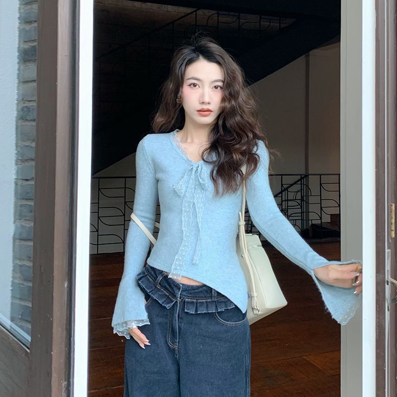不規則なブルーのVネックレースレース長袖Tシャツレディース初春スリムで優しいスタイルのベルスリーブトップ