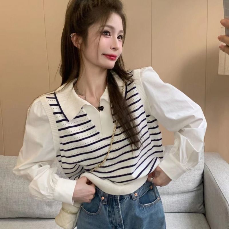 2023新型の韓国版の外着のゆったりした上着のニットの女性の秋の偽の2つのpoloの襟は長袖のストライプをつなぎ合わせます。