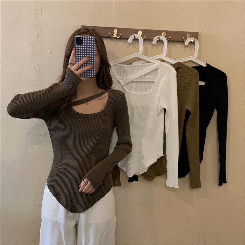 2023秋冬フランスの不規則な純粋なニットの底のシャツの女性の中でデザイン感の小さい大衆の短いタイプの鎖骨の上着を掛けます。