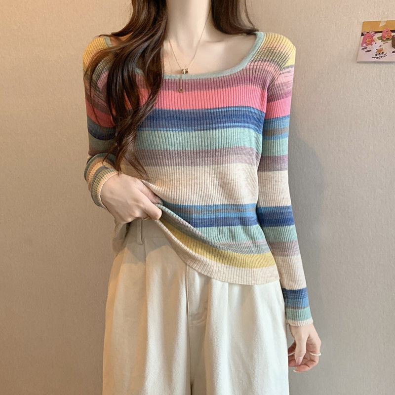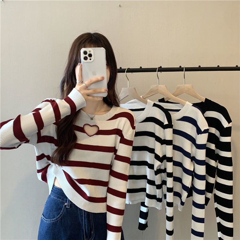 秋冬ネット赤2023新デザイン感小衆愛透かし彫り縞長袖tシャツ女ニット女