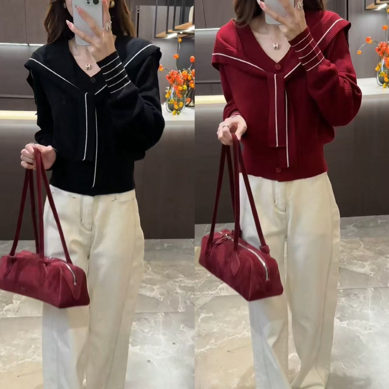 韓国版の小香風の海軍の襟はマントのニットの長袖のカーディガンの女性を配合します。