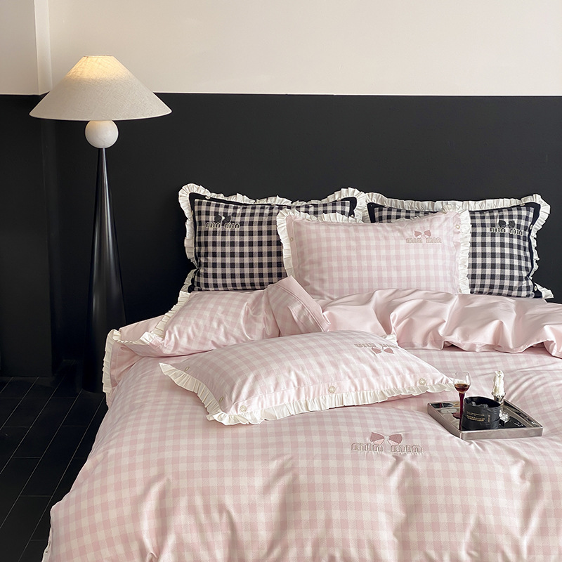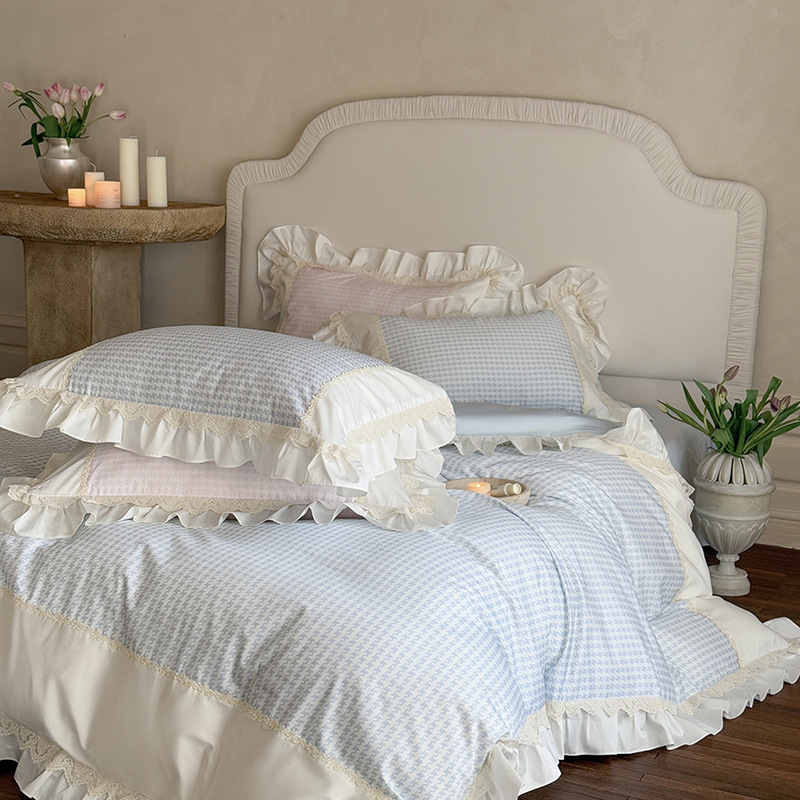 フランス式王女風長絨毛綿シーツ4点セット綿綿綿綿綿高級感千鳥格布団カバーベッド用品ピンクブルー
