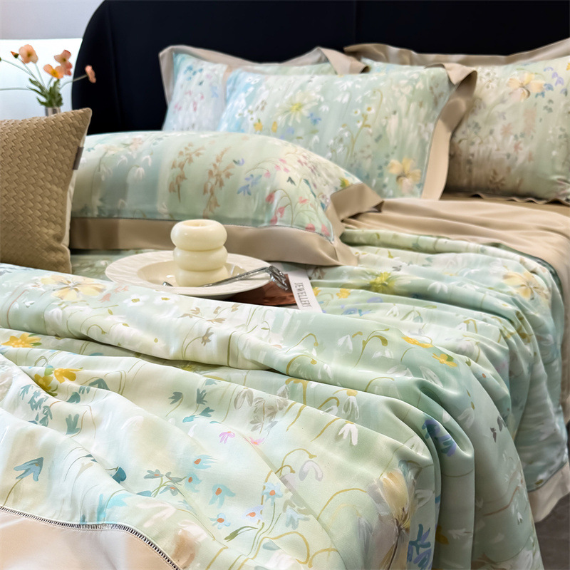 アメリカンパストラルフラワー翡翠リヨセルシルク滑らかで涼しく通気性のある寝具4点セットキルトカバーシーツ