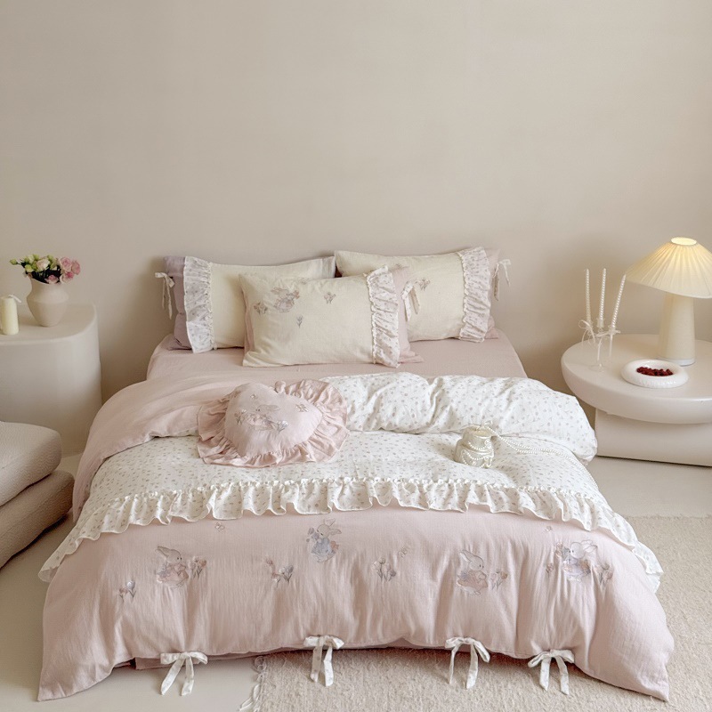 フランス式プリンセス風少女心全綿超柔雲霧紗デジタルプリント刺繍寝具四点セット布団カバー