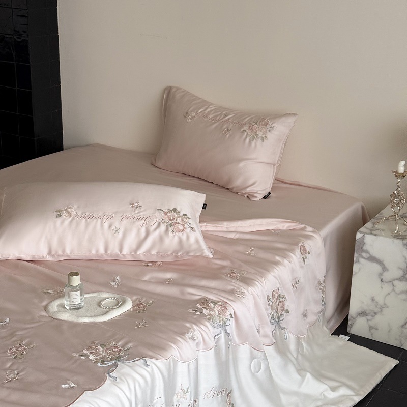 60S レンチングテンセルスイートハートガール刺繍ダブルサマーキルト洗濯機洗えるシルキーな質感裸で寝るためのエアコン付き薄いキルト