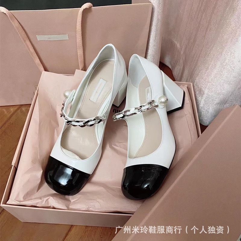 高版iu家復古メアリー珍4 ~ 7センチのフランス色の小さな靴真珠チェーン漆皮の厚いサンダル