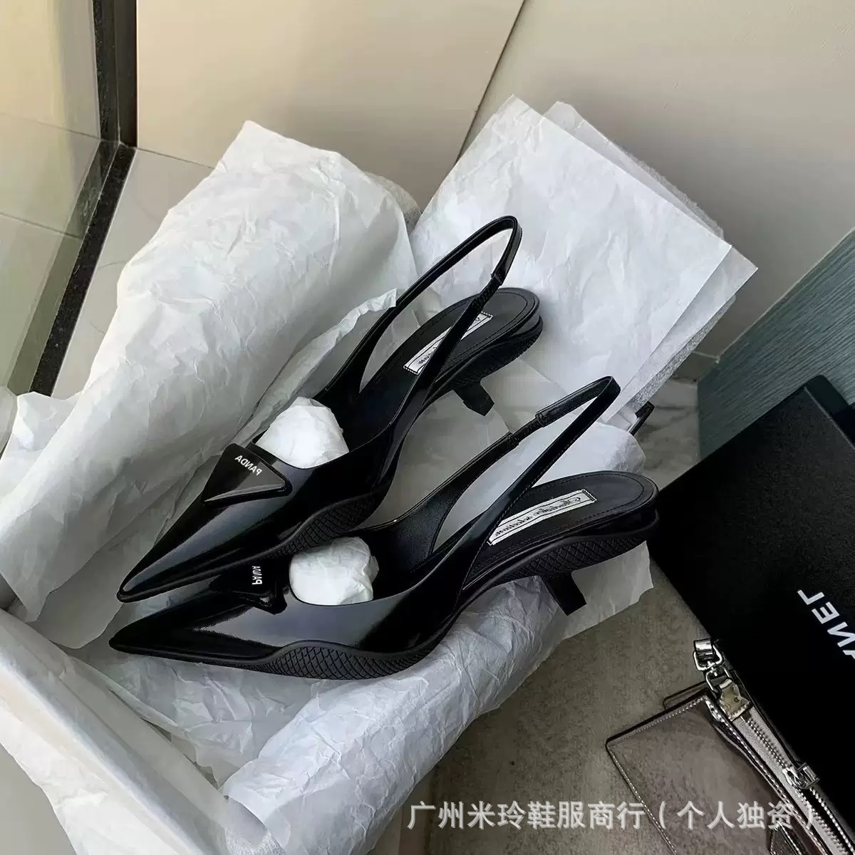 高品質 P ホームキャットヒールサンダル女性用本革バージョン 2025 新しいポインテッドトゥ子猫ヒール三角ラベルパテントレザーハイヒール L