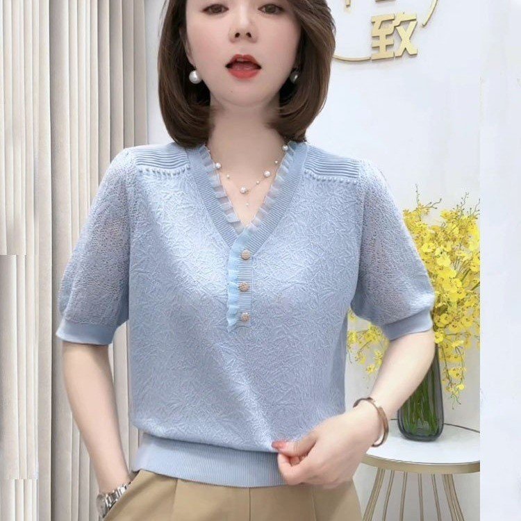 ドロップシッピング 2025 新しい夏のファッショナブルで多用途な年齢を減らすレース V ネックビーズ無地半袖 T シャツ