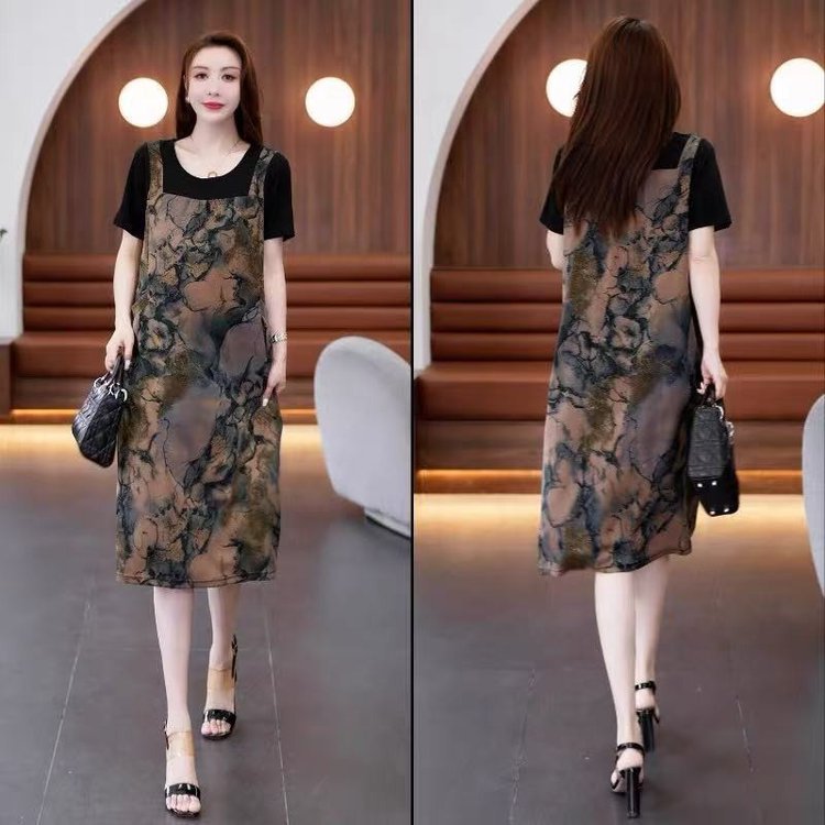ドロップシッピングファッション偽ツーピース半袖ドレス 2025 夏の新しい韓国スタイルの年齢を減らすルーズミッドレングススカート