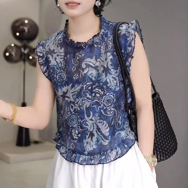 ドロップシッピング 2025 夏のファッショナブルな花柄耳プリントバックボタンノースリーブベストシャツトレンディ