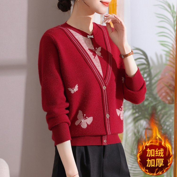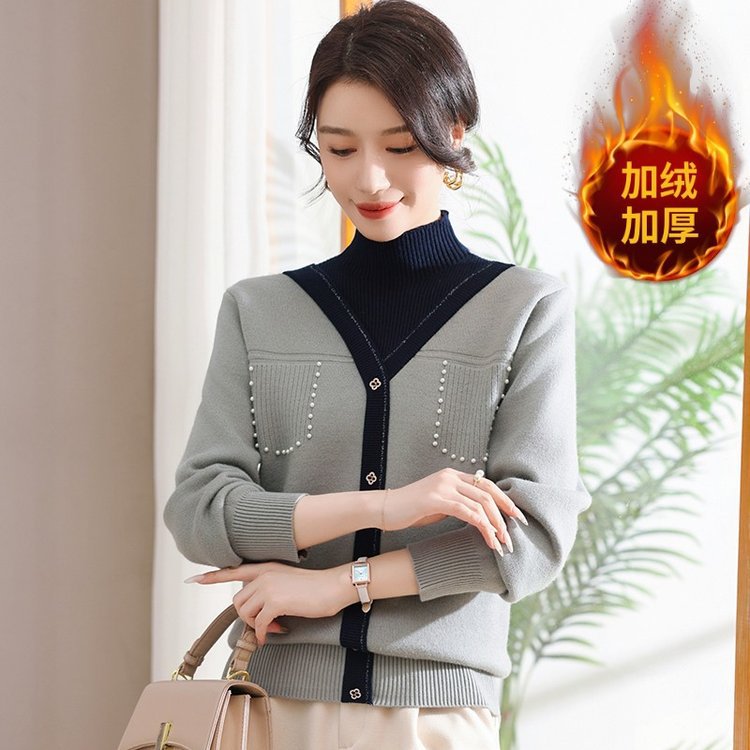 2024秋冬の新型の一体の絨毯の偽の2つのベルベットの厚いセーターのファッションの気質の百合の洋気のお母さんの上着
