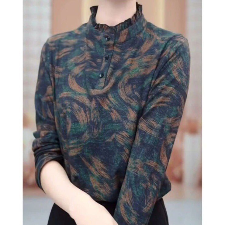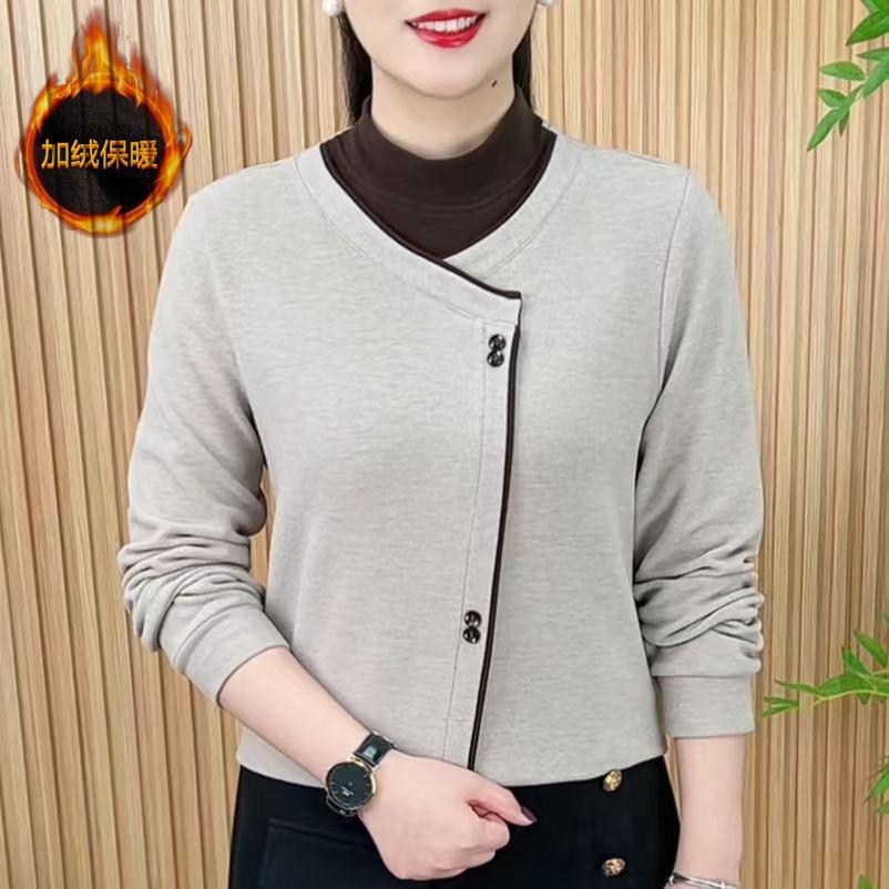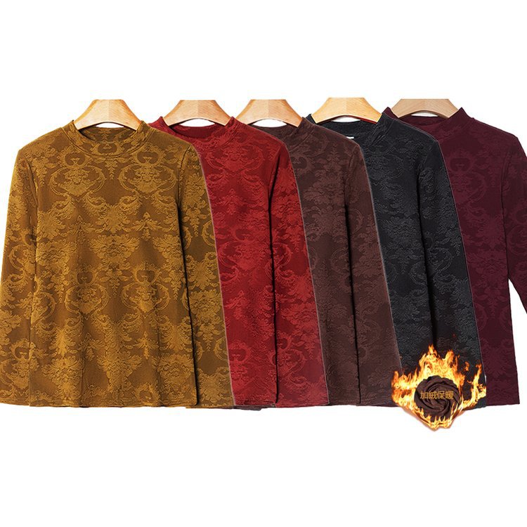 2024秋冬の新型ベルベットの厚手のシャツの中で高齢者のお母さんの半高襟のジャカードのゆったりした快適な上着の女性