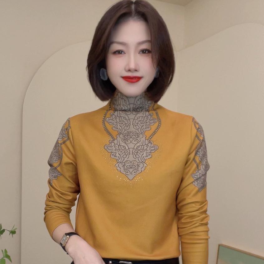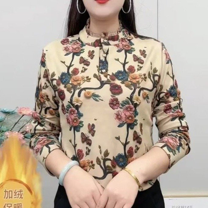 秋冬のベルベット保温ジャカード中国式半高襟シャツ2024ファッション洋気純色百合上着女
