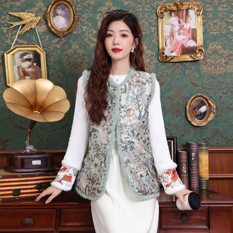 秋冬の新型の綿入りの錦織の中国式の盤は国風の復古のジャカードのベストのファッションの気質を掛けます。
