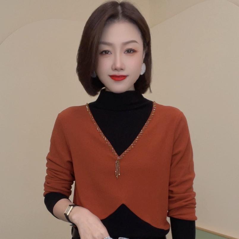 2024新型秋冬とベルベットの偽の2つのファッション的な洋風のお母さんはニットのセーターの女性の半高襟の厚い上着を着ます。