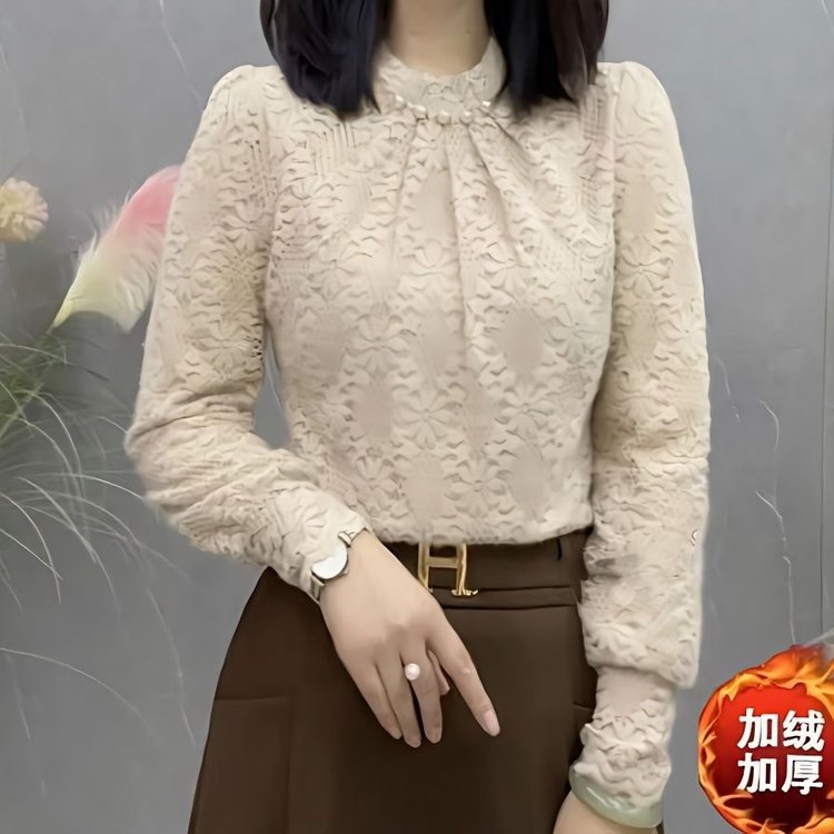 2024秋冬の新型ベルベットはファッション真珠襟の長袖気質に合わせてレース上着の女性のシャツを厚くした