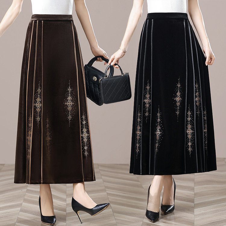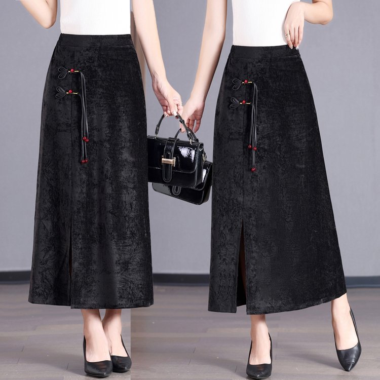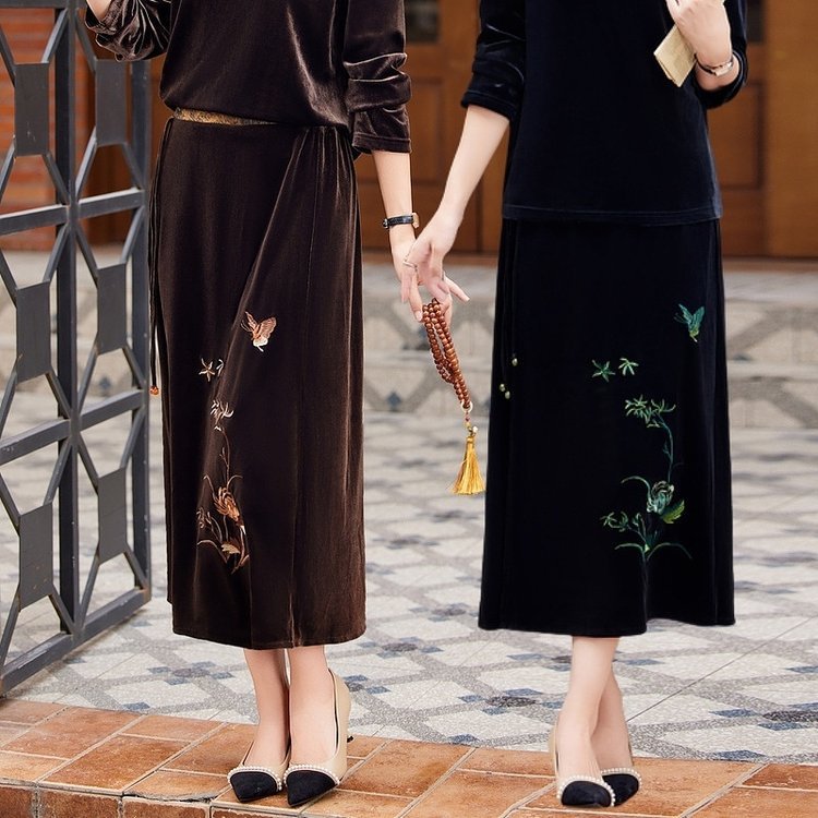 2024秋冬の新型国風の金のベルベットの刺繍の中国式の百合の半身のスカートの女性の高腰の気質の優雅な中で長いスカート