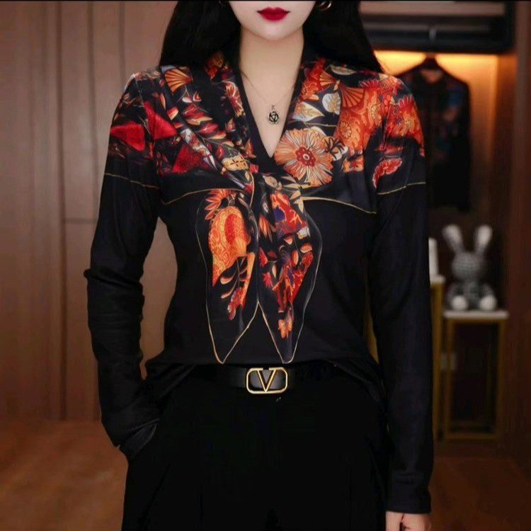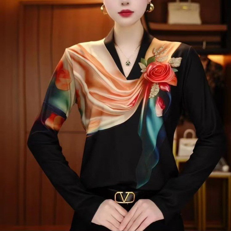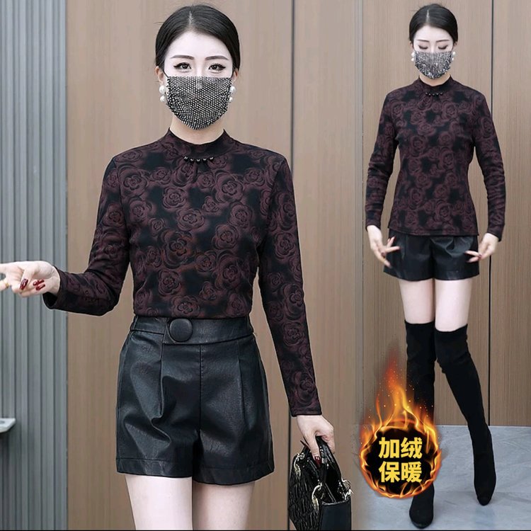 2024秋冬の新型ベルベット長袖弾力ネット糸プリント気質上着ファッション洋気内に保温ブラウス