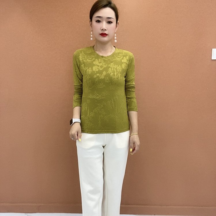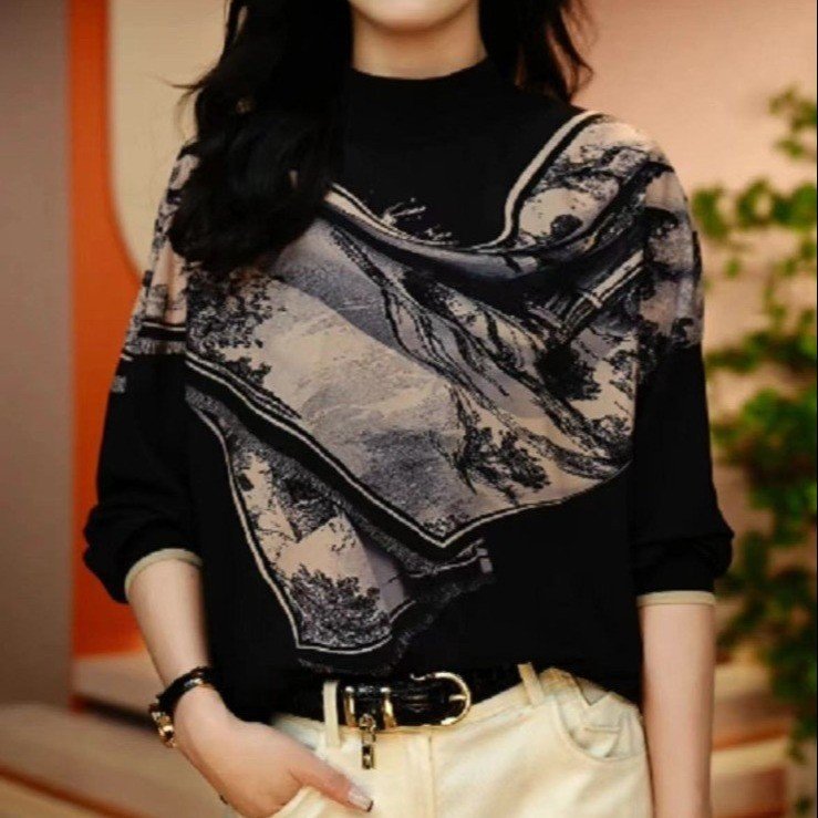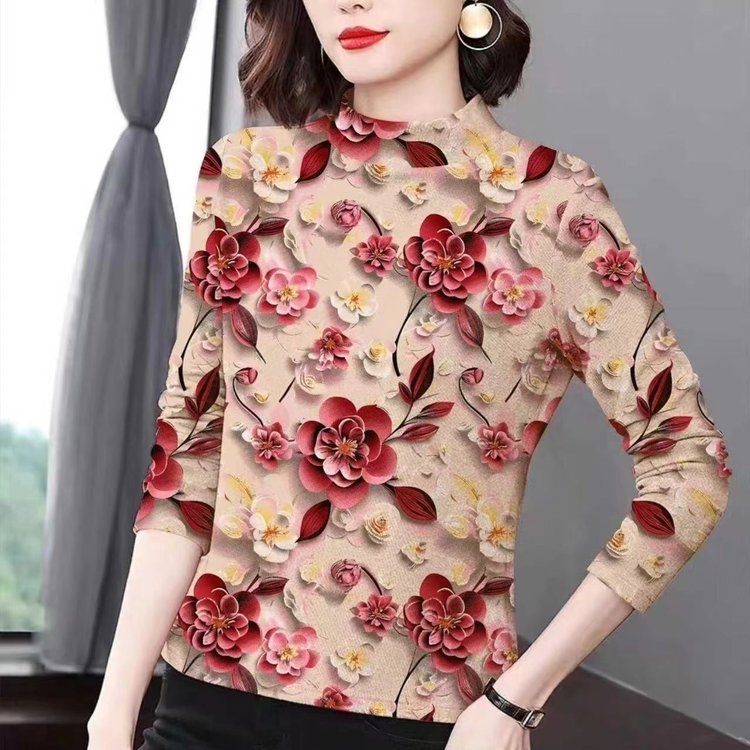 2024秋の底のシャツの女性の新型のファッションのプリントの半高襟の長袖のtシャツのお母さんの服装の中で百合の上着を掛けます。
