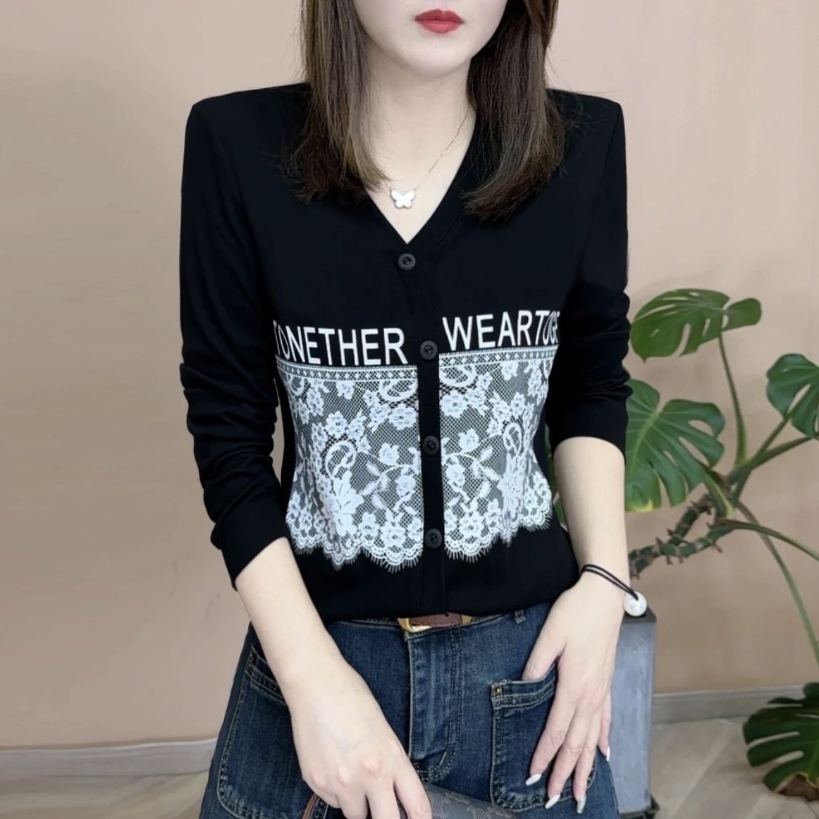 震え音が爆発したvネックレースプリント長袖tシャツ2024ファッション洋風カジュアルな服装が痩せているシャツ
