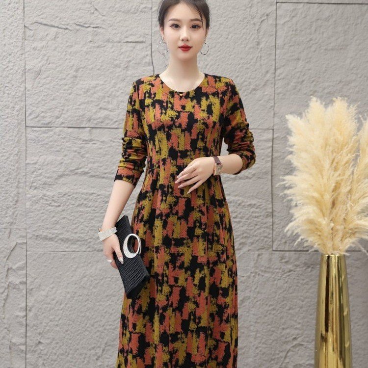 2024秋の新型ファッション洋気中高年ワンピース腰を収めてやせている洋気レトロなプリントが膝を越えたスカート