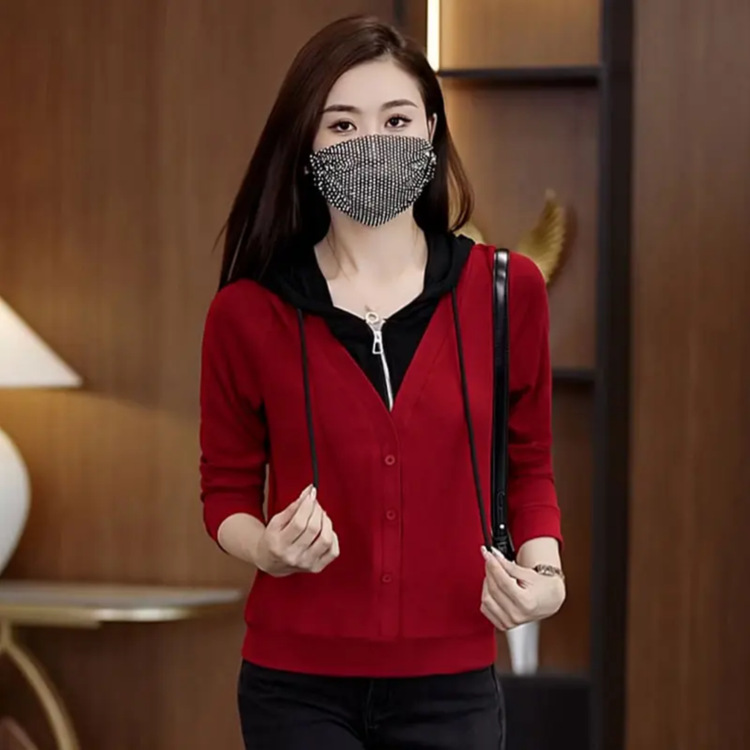 秋の新型偽二枚のフード付きの女性2024ファッション気質が色にぶつかって、スリムな長袖tシャツをつなぎ合わせます。