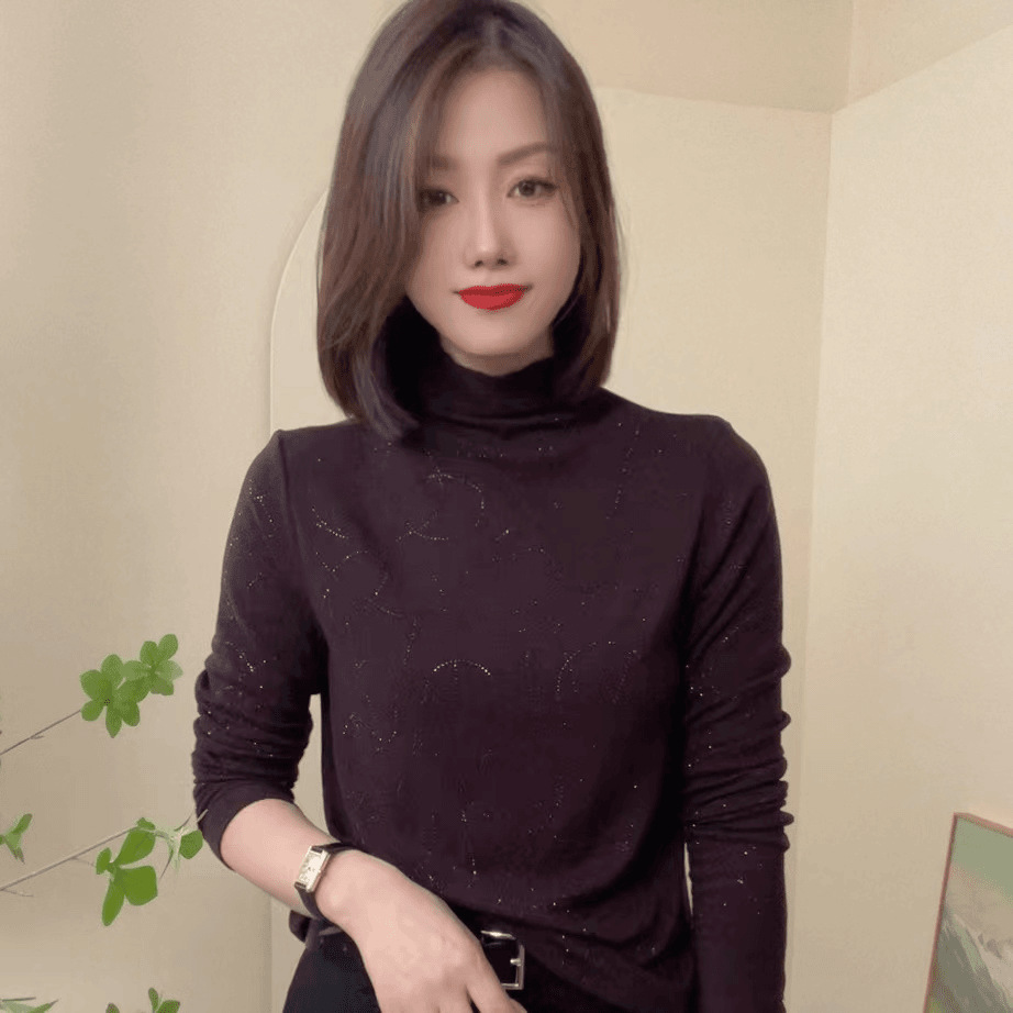 高級フランスの名媛の軽豪華な亮糸はドリルの半高襟の底のシャツの秋の新型の修身がやせている長袖のtシャツを現します。
