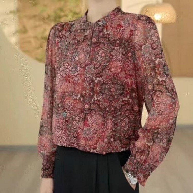 軽豪華貴夫人の高級プリント丸襟シャツ女2024秋の新型百合はやせた気質の減齢シャツを見せている