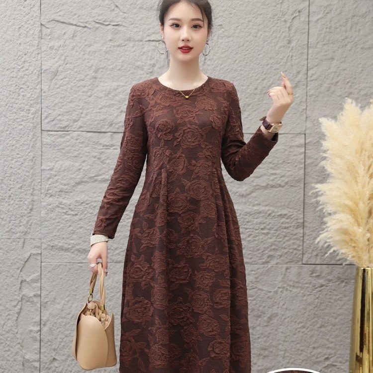 秋冬新作高級ファッションジャカードワンピース2024洋風減齢丸襟カジュアル気質ミディアムスカート