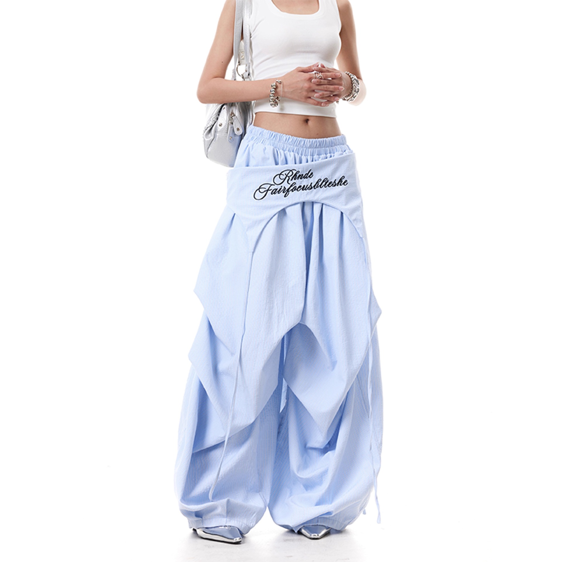 アメリカンレター刺繍プリーツカジュアルストライプワイドレッグパンツ婦人服2025ルーズ夏ストラップ空挺部隊パンツ