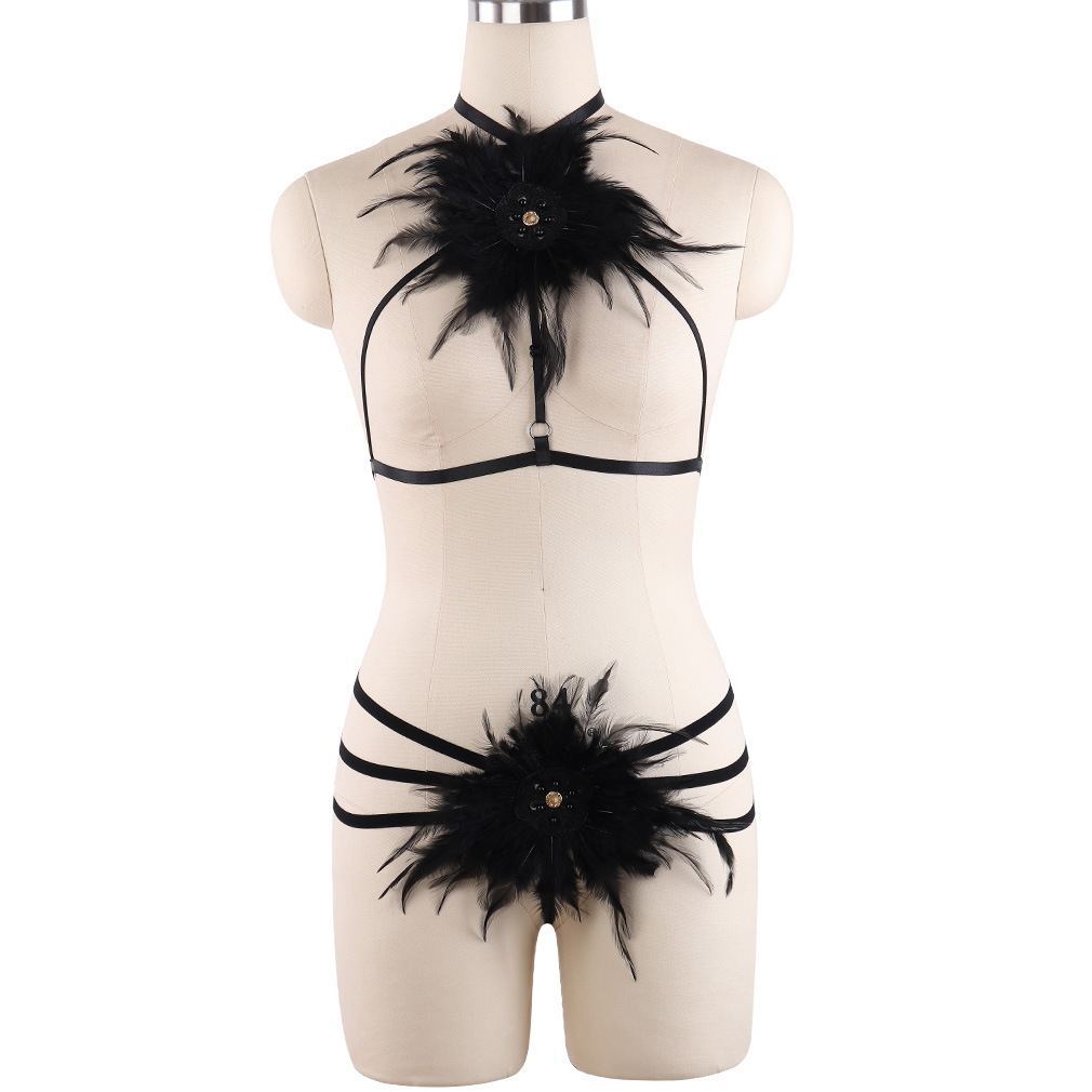 欧米の人気のある羽毛は三点式のセクシーなバンドの黒い女性の情緒のスーツを誘惑します。