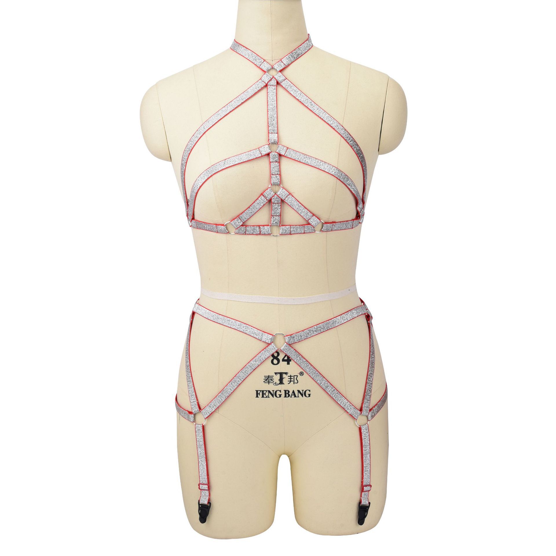 速売通セクシーハーネスバンド銀色のきらきらとした透かし彫りで女性の趣味下着セットを誘惑する