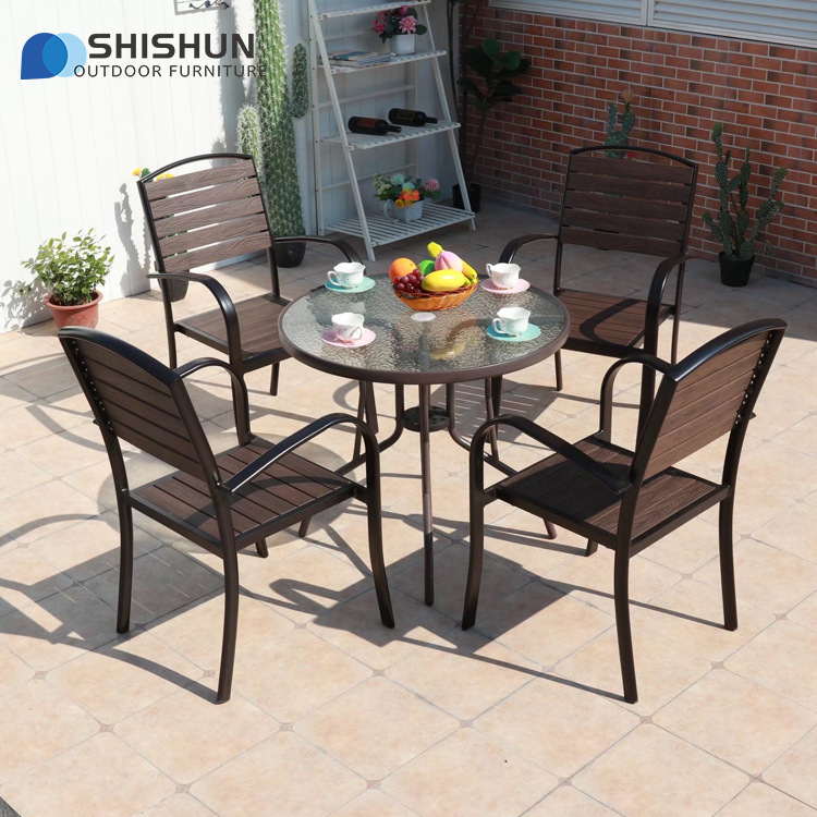屋外のテーブルと椅子の庭の防腐木の花園の四角のテーブルのベランダの屋外の露天の喫茶店の外でレジャーのプラスチックのベンチを並べます。