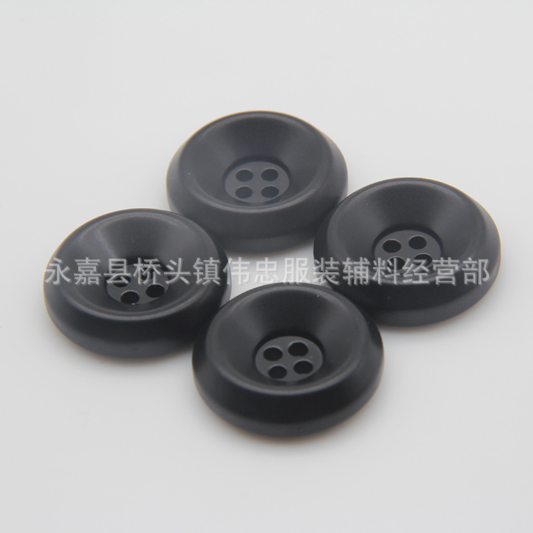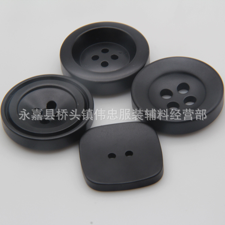 黒い樹脂のコートのボタンはつや消しです。黒い四眼のボタンは両面の毛です。