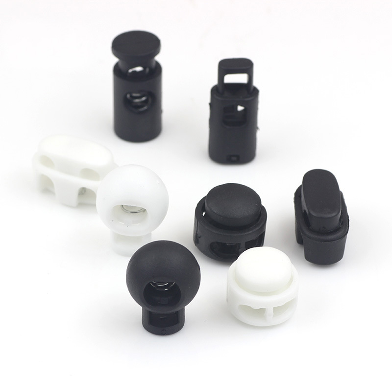 プラスチック製のスプリングバックルが白い調節ボタンの手提げ袋ナイロンの両穴豚の鼻ボタンが丸い黒色です。
