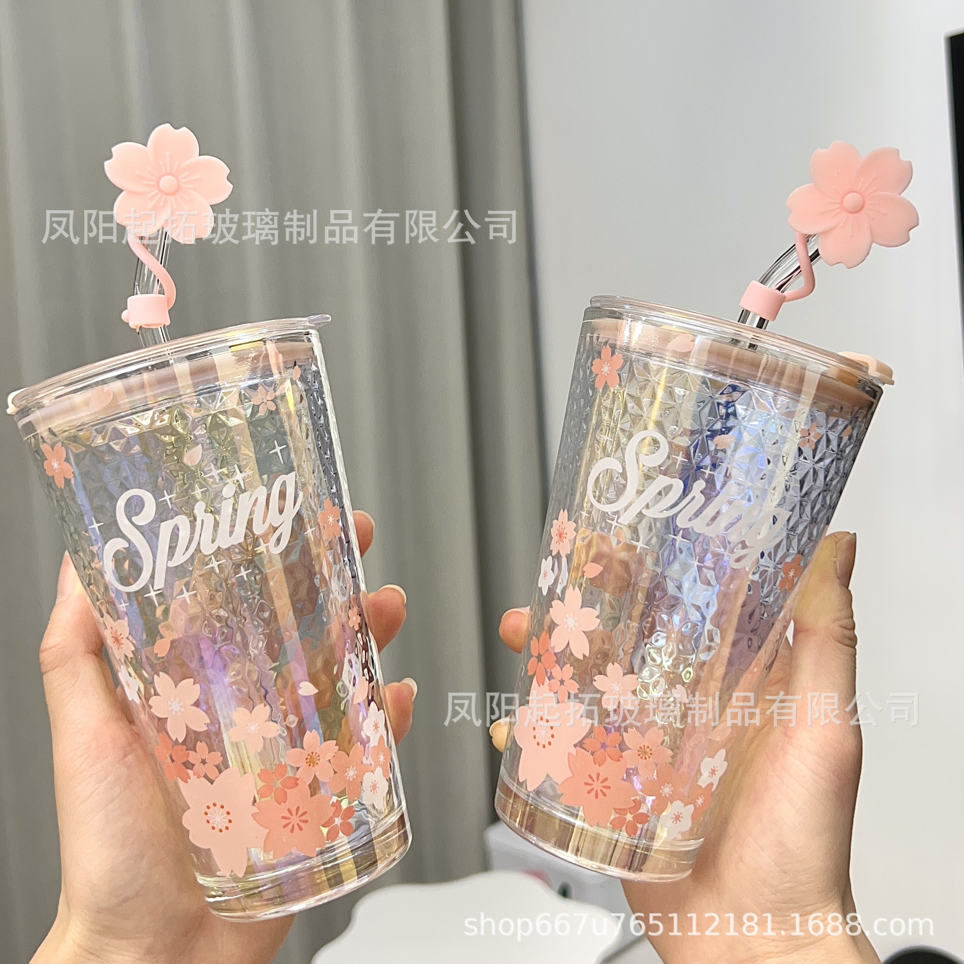 漫画ロマンチックな桜グラスストロー付きカップクリエイティブかわいいオフィスカップジュースミルク朝食カップ