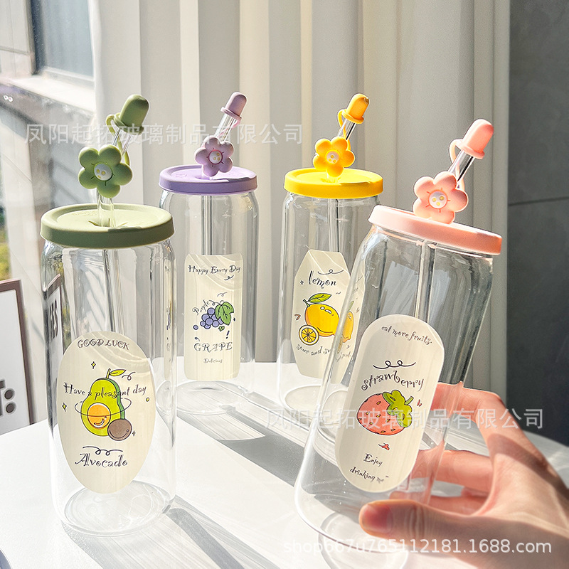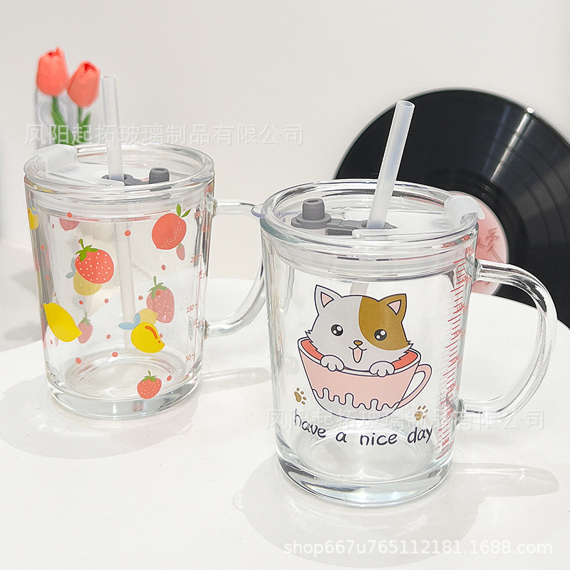 かわいいガラスコップ高颜値耐高温ストロー蓋付きカップ随行コーヒーカップ朝食牛乳グラス