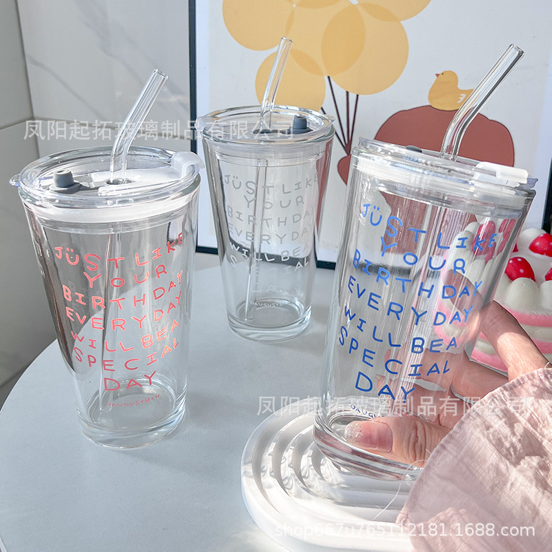 カップins高颜値ガラスストローコップ学生サラリーマン小衆カップコーヒーミルクカップ蓋付き