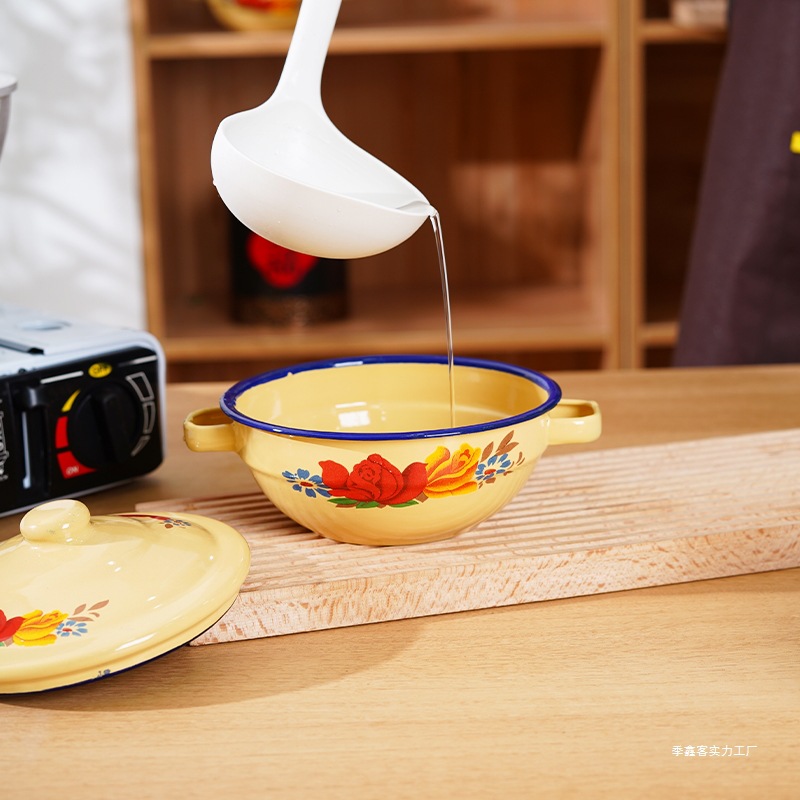 111V 耳付き蓋付きエナメルボウル、昔ながらのエナメルボウル、70年代のノスタルジックなボウル、特製デザートボウル、市井鍋