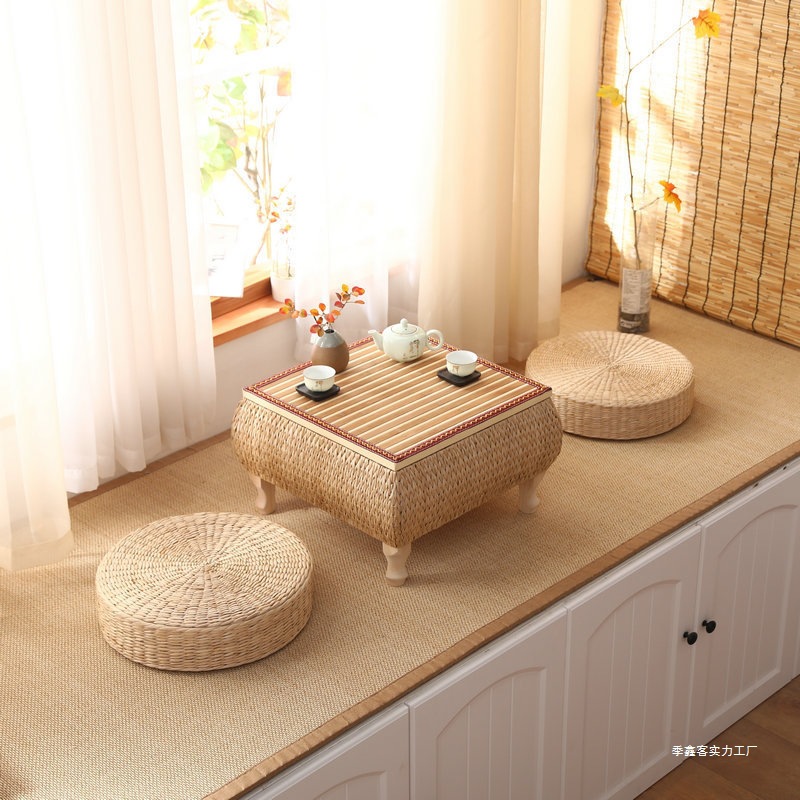 藤編み茶の何畳かの窓と椅子と日本式の草編み茶の何台かの低い茶卓のオンドルの上の小さい茶卓