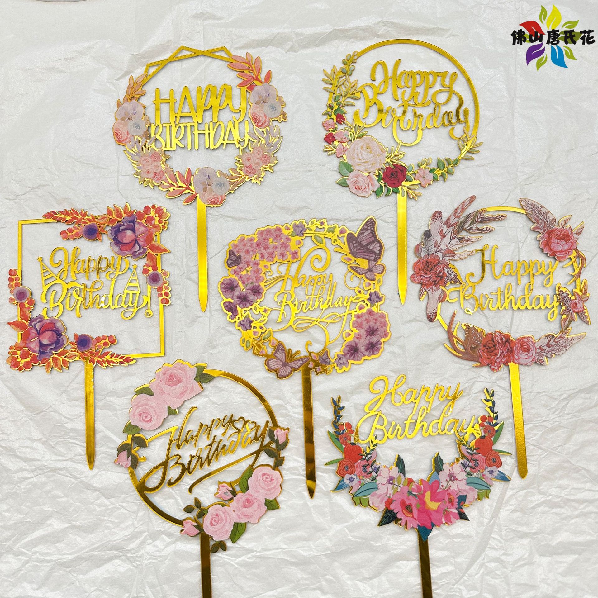 アクリルケーキイラストins風花UVカラープリントHappy birthdayデザート装飾プラグインクロス