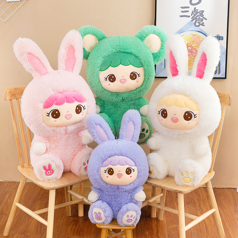 新しいネットの赤い綿の人形のぬいぐるみは長い毛のウサギの人形に変身します。