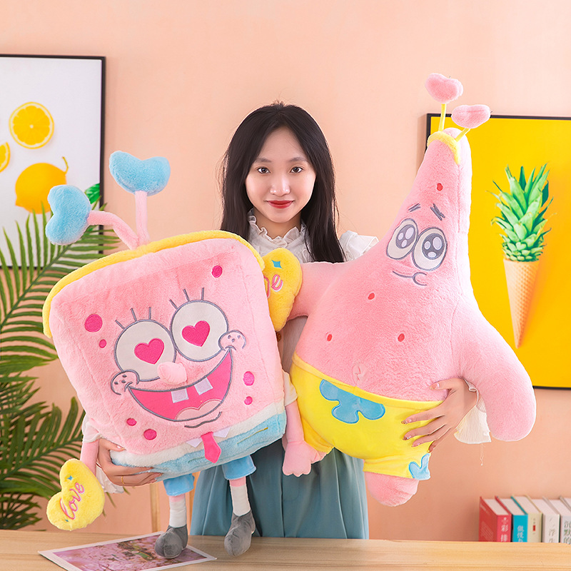 ピンクのスポンジの赤ちゃんは大星の人形の大きさを選んでぬいぐるみを選んで枕の女の子を抱いて寝て子供にプレゼントします。