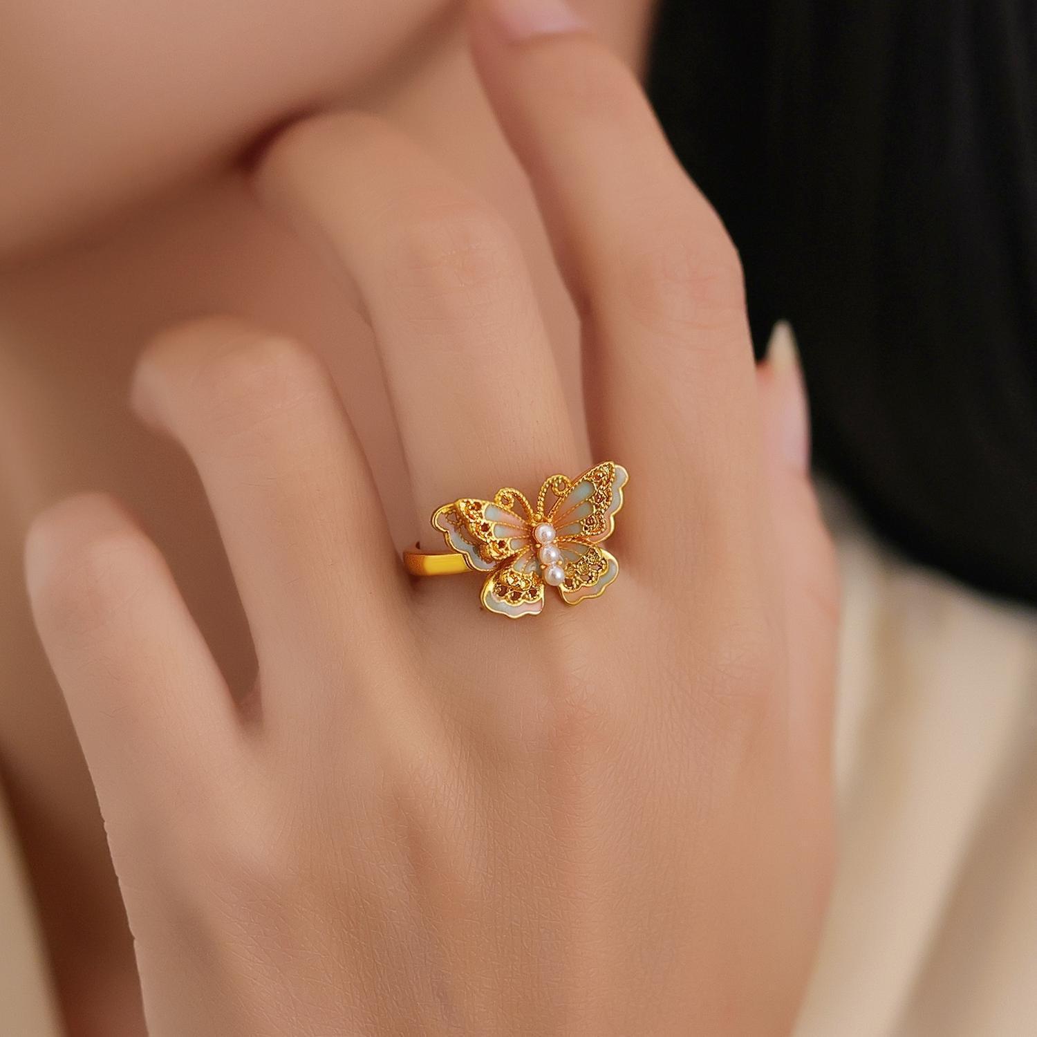 真珠のカラーの蝶の指輪の女性の新しい中国式の古風の復古の文芸のファッションの気質の高級感の百合の指の輪の女性