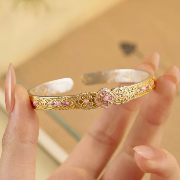 新しいレトロな金彩ピンクエナメル吉祥如意牡丹の花のブレスレット、女性用中国風エナメル彩国風ギフト