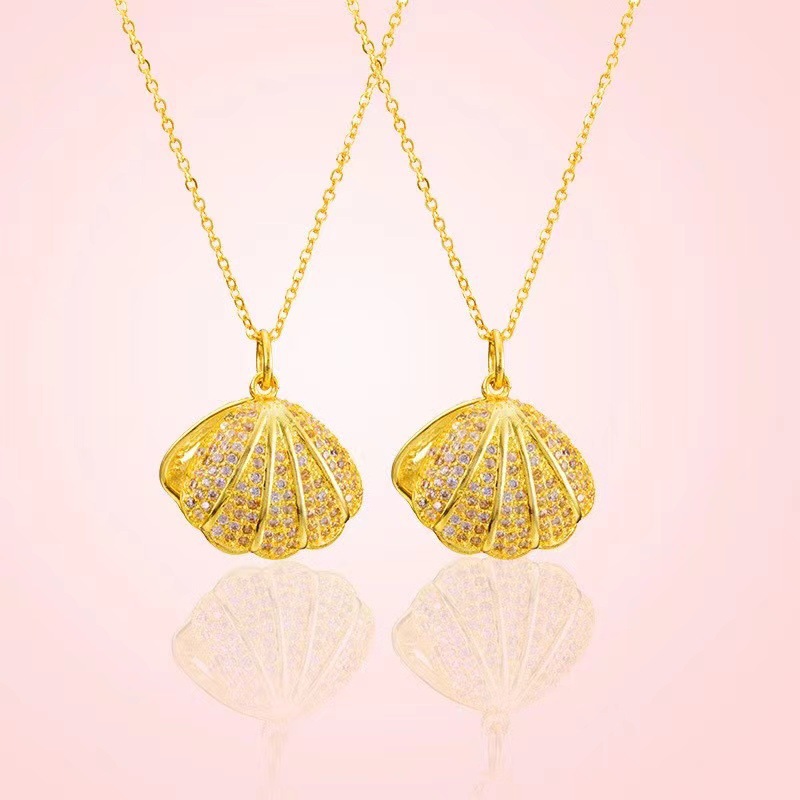 江銘の韓国版の個性はダイヤモンドの扇形の貝殻の真珠の金メッキのネックレスを入れます。