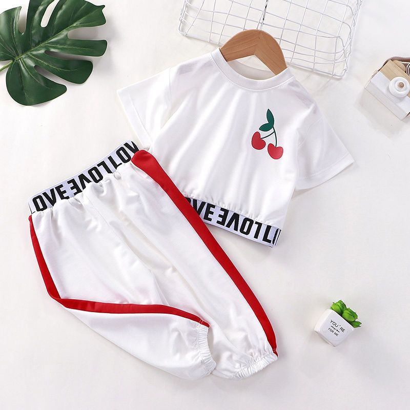 女の子の短いtシャツの子供の洋風のスーツはへその夏服の新型の赤ちゃんの洋風の流行の中で袖の2つのセットを漏らします。