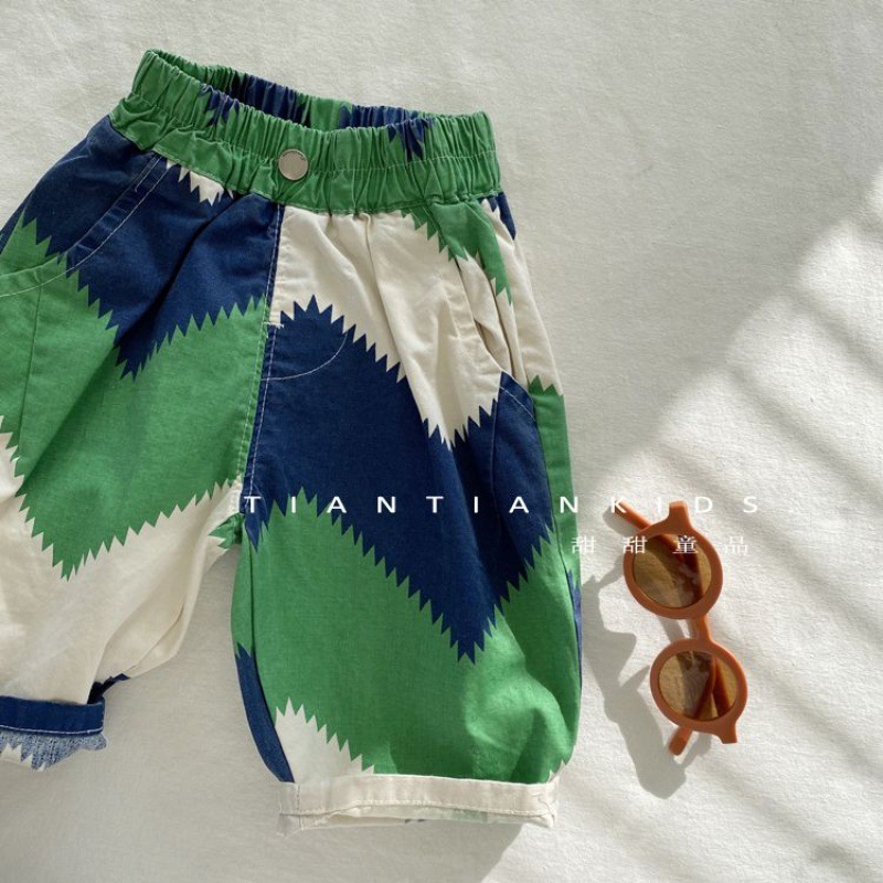 男の子の洋風の色合わせのカジュアルなズボンの子供2022夏の新しい女性の赤ちゃんの通気性の薄いタイプの綿布のズボンの5分のズボン